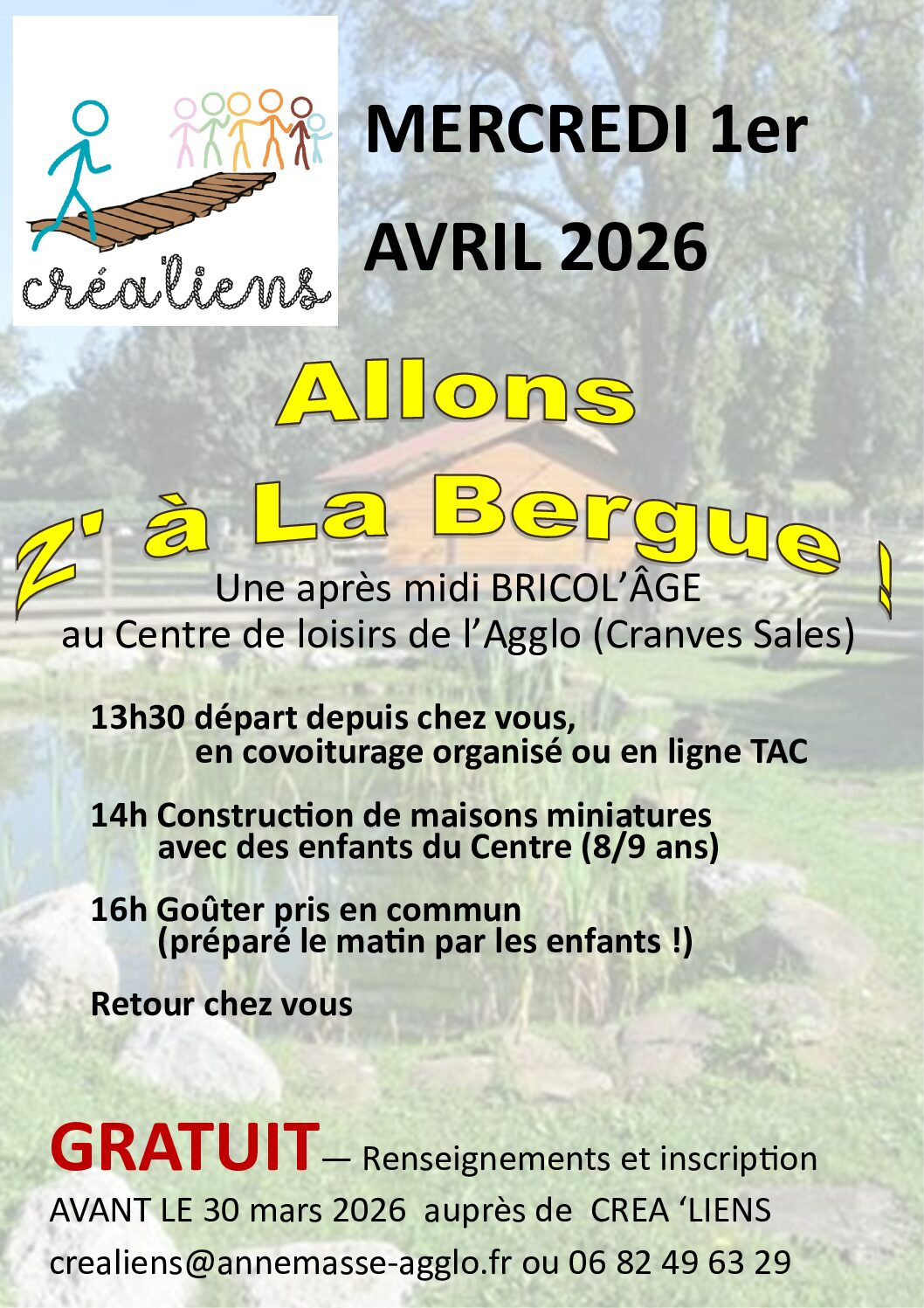 Allons z’à La Bergue! 19 mars 2026 Une après midi bricol’ âge affiche 1er avril 2026 Allons Z’à La Bergue#3 Les autres actualités AG La Liane Vendredi 20 mars à 20h - salle des Voirons - Le Diapason 284 route de… La grande lessive La grande lessive 19 mars 2026 AG LA PERSJUSSIENNE AG Pers-Jussienne