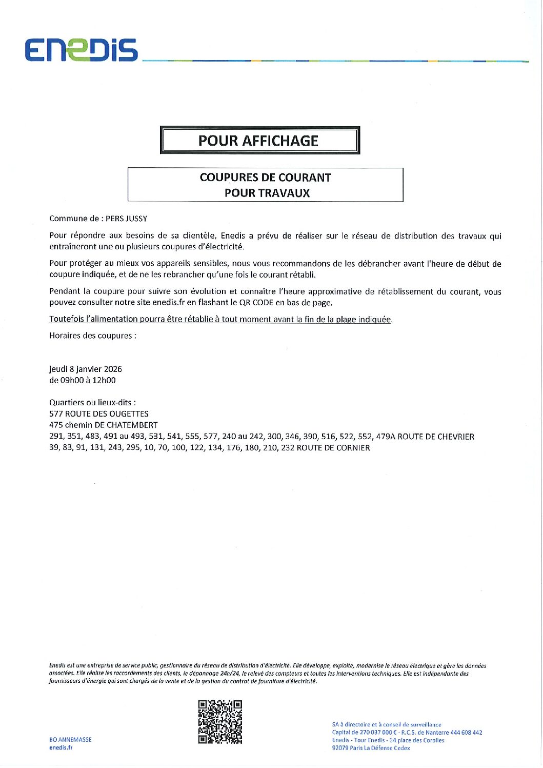 Coupure de courant Enedis vous informe qu’une coupure de courant est prévue le jeudi 8 janvier 2025, de…