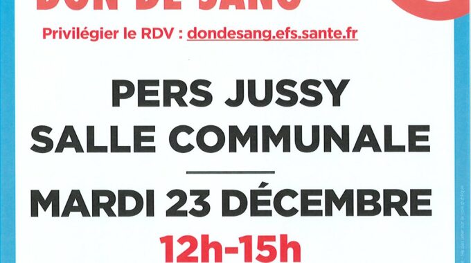 Vente à domicile 28 janvier 2025 Salon du VDI Dimanche 2 février à la salle communale de 10h à 17h VDI Les autres actualités Don du sang Le mardi 23 décembre 2025 de 12h à 15h à la salle communale de Pers-Jussy La Mairie et la Poste déménagent Illumination du sapin de Noël Noël 2025 - Final (002)